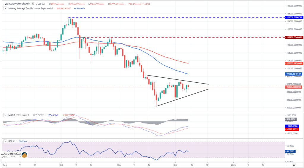 به گزارش شبکه اطلاع‌رسانی طلا و ارز بیت‌کوین در آغاز هفته با ثبت قیمت بالای ۹۱,۰۰۰ دلار روندی مثبت را دنبال می‌کند و این دومین روز متوالی رشد برای ارز دیجیتال پیشرو محسوب می‌شود. این حرکت صعودی، نشانه‌ای از بهبود نسبی تقاضای بازار است و همزمان فشار فروش کوتاه‌مدت کاهش یافته است. معامله‌گران تکنیکال هم‌اکنون توجه ویژه‌ای به خط مقاومت بالاسری الگوی مثلث متقارن دارند، الگویی که با اتصال سقف‌های ۱۵ نوامبر و ۳ دسامبر شکل گرفته و محدوده حدود ۹۳,۵۰۰ دلار را به عنوان مانع اصلی پیش روی روند صعودی مشخص کرده است.